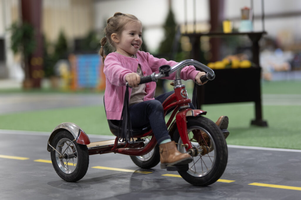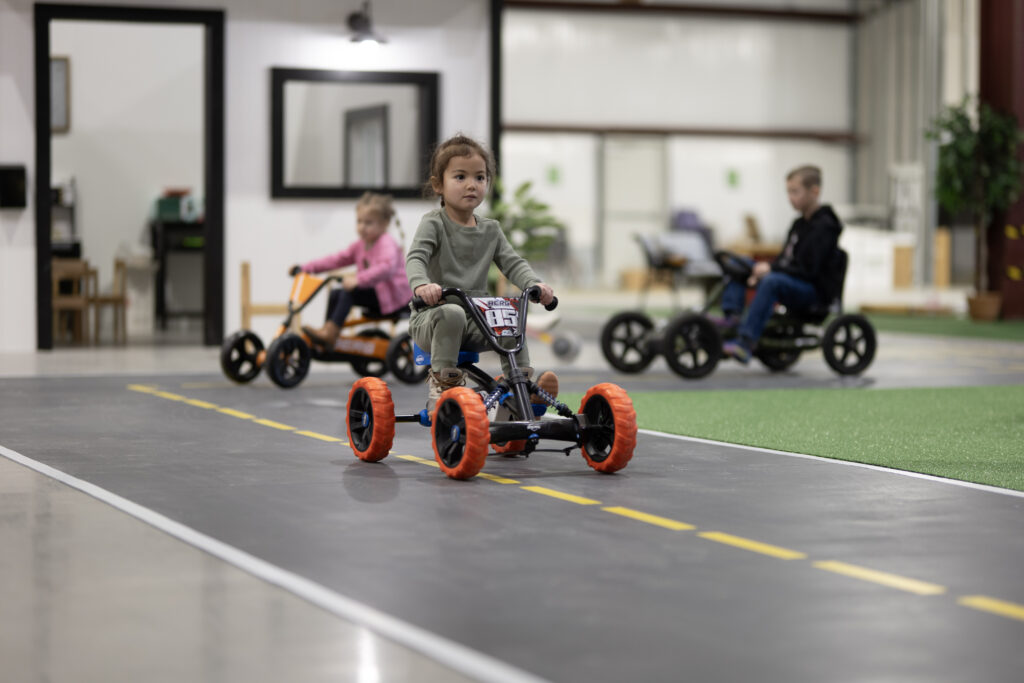 Kids can drive around the indoor park on the riding track.